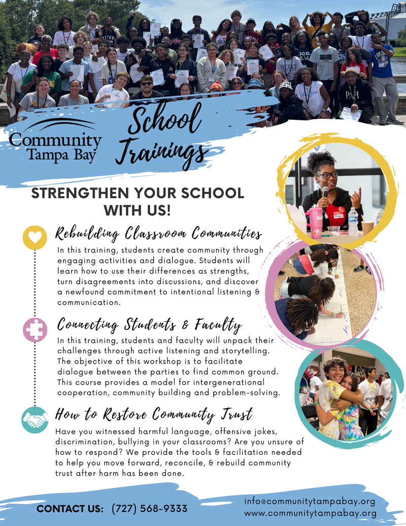 Community Tampa Bay’s expert facilitators offer in-school trainings and workshops for both middle and high students and faculty to help build an anti-discrimination environment. Through adaptable trainings and interactive workshops, we can cover topics from community building, inclusion and belonging, how to lead with empathy and curiosity, finding common ground, ways to interrupt biases and prejudice, engage in meaningful dialogue across differences, and so much more. These trainings and workshops are designed to give students the inspiration and the tools they need to create more inclusive spaces for all and can be updated to address the specific needs, incidents, and/or culture of your school and community. We also offer follow-up sessions with students and faculty to process lessons learned, and ensure the sustainability of the dialogue started by the training session.